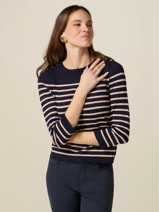Maglia girocollo realizzata in filato misto viscosa; lavorazione a righe orizzontali, maniche a tre quarti; dettaglio di bottoni gioiello applicati sulle spalle.