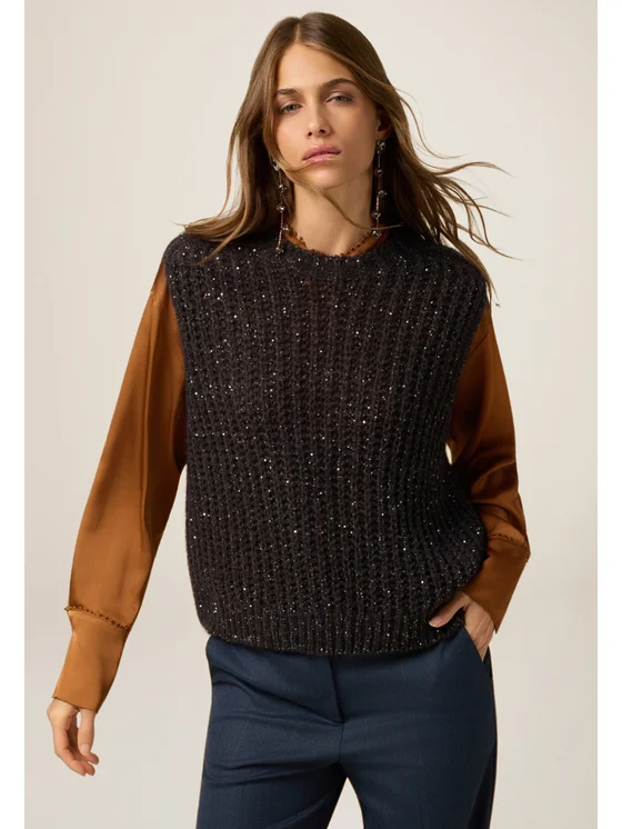 Maglia senza maniche realizzata in cado filato misto mohair; scollatura tonda, ricamo in micro paillettes; MADE IN ITALY.