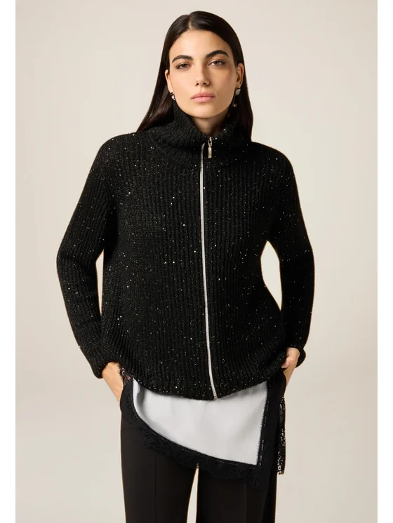 Cardigan realizzato in maglia pesante; modello corto con chiusura a zip metallica frontale; ricamo in micro paillettes all over; MADE IN ITALY.