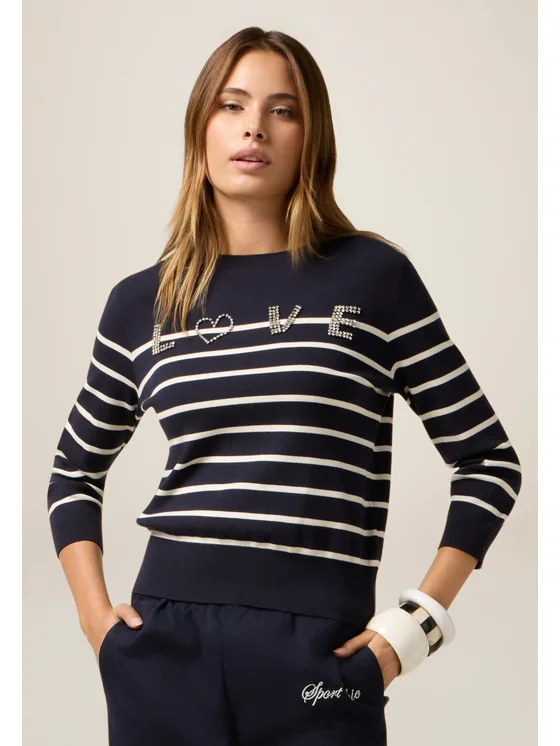 Maglia realizzata in filato misto viscosa; lavorazione a righe, linea slim, maniche a tre quarti, scollatura girocollo; applicazione lettering in cristalli, davanti.