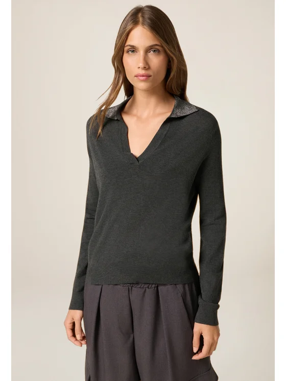 Maglia realizzata in filato misto viscosa; scollatura a V e colletto ornato da micro cristalli; maniche lunghe, linea slim.