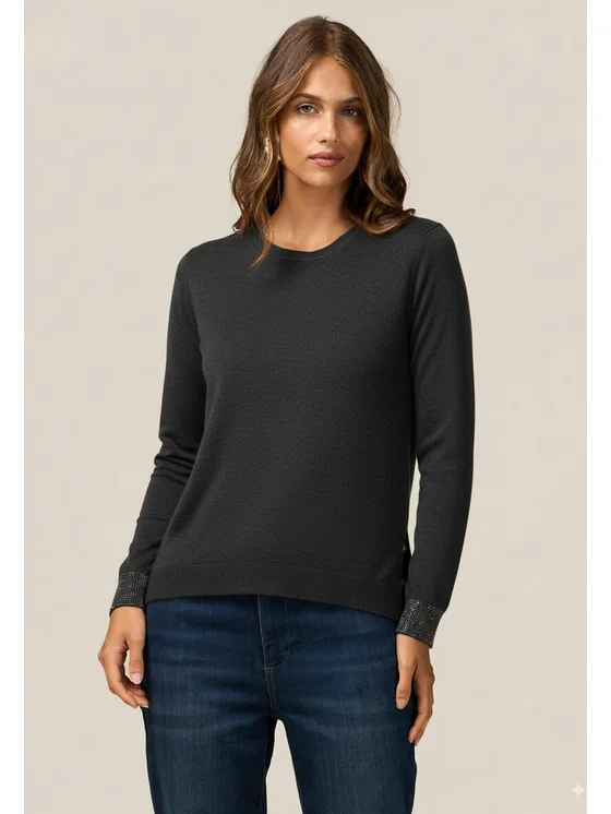 Maglia realizzata in filato misto viscosa; polsini ornati da micro cristalli; scollatura a barchetta, chiusura con bottoni sulla schiena.