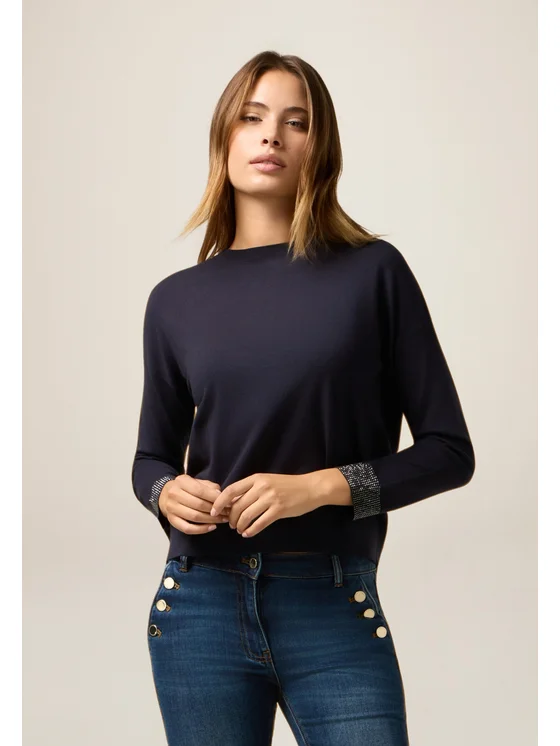 Maglia realizzata in filato misto viscosa; polsini ornati da micro cristalli; scollatura a barchetta, chiusura con bottoni sulla schiena.