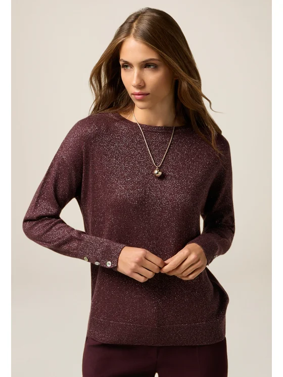 Maglia girocollo realizzata in filato misto cashmere con inserto di filo lurex; linea dritta, lunghezza regolare; dettaglio di bottoni combinati sul fondo maniche.
