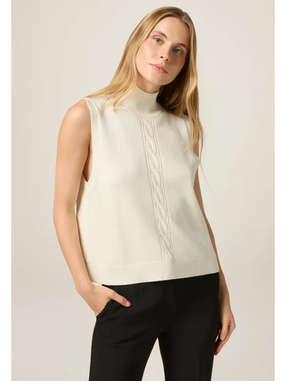 Maglia senza maniche realizzata in filato misto lana; lunghezza media, collo dolcevita; lavorazione a trecce centrale sul davanti, bordi a coste.