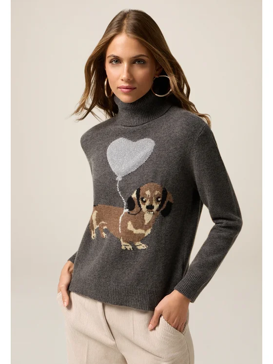Maglia realizzata in filato misto lana; lavorazione jacquard davanti, impreziosita da castoni e applicazioni; collo alto dolcevita, maniche lunghe.
