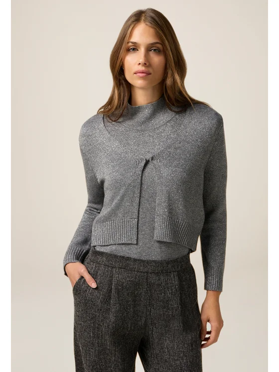 Cardigan corto realizzato in filato lurex misto lana; scollatura a V e chiusura a gancetto; maniche lunghe.