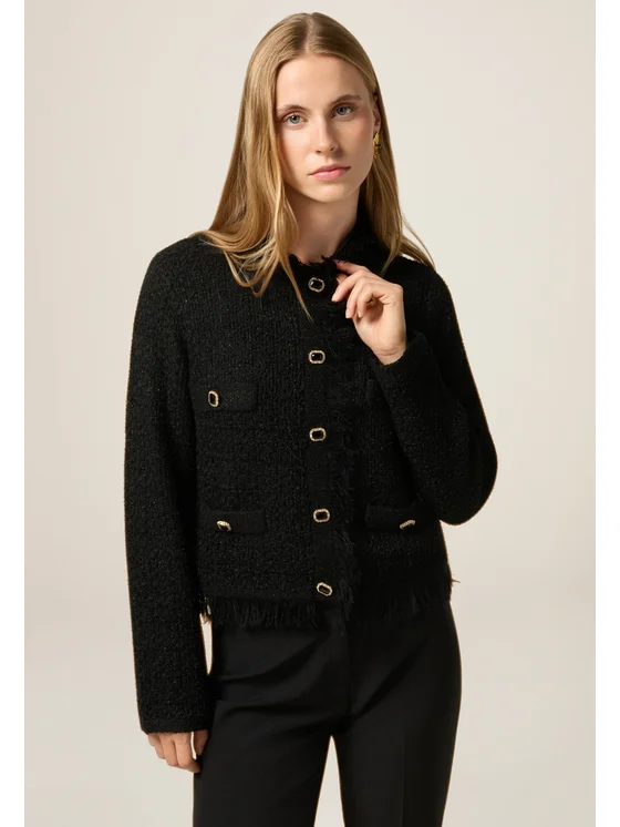Cardigan in maglia pesante realizzato in filato misto lana; lunghezza media con chiusura frontale a bottoni; colletto alto, maniche lunghe, frange decorative sul bordo inferiore e sul collo; dettagli di bottoni decorativi applicati sul davanti.
