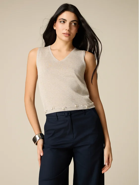 Top realizzato in filato lurex misto viscosa; modello corto con scollatura a V simmetrica davanti e dietro; ricamo in perle e castoni sul fondo; possibilità di creare un twin-set con il cardigan coordinato. MADE IN ITALY.