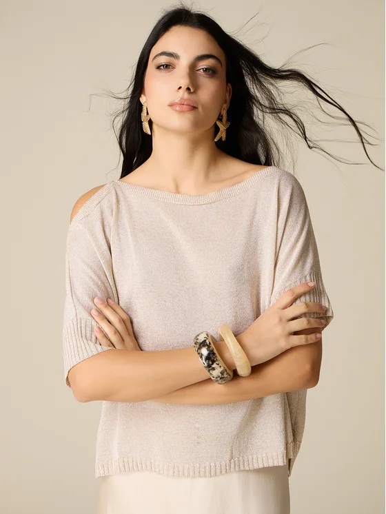 Maglia realizzata in filato lurex misto viscosa; taglio corto con fitting morbido; scollatura a barchetta, maniche corte con dettaglio cut-out sulle spalle, polsini a costine; MADE IN ITALY.
