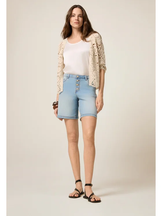 Bermuda realizzati in denim a lavaggio chiaro; chiusura a bottoni decorativi sulla patta; modello cinque tasche.