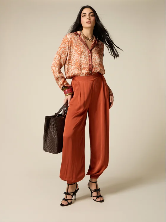 Pantaloni palazzo realizzati in fluido raso di viscosa; vita elasticizzata internamente dietro e dettaglio di pince frontali; polsini elasticizzati sul fondo gamba; MADE IN ITALY.