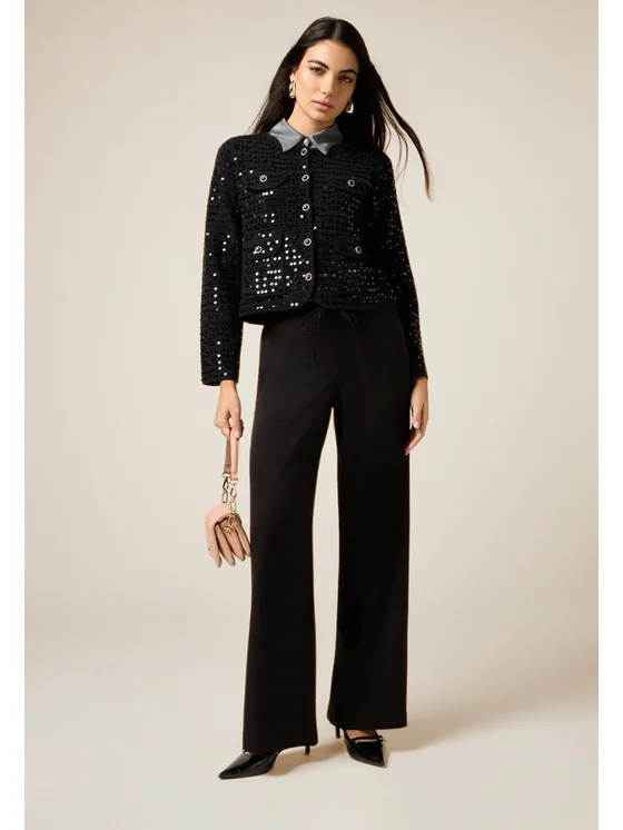 Pantaloni joggers a palazzo realizzati in tessuto fluido; vita elasticizzata con coulisse regolabile; tasche laterali inserite nei fianchi.
