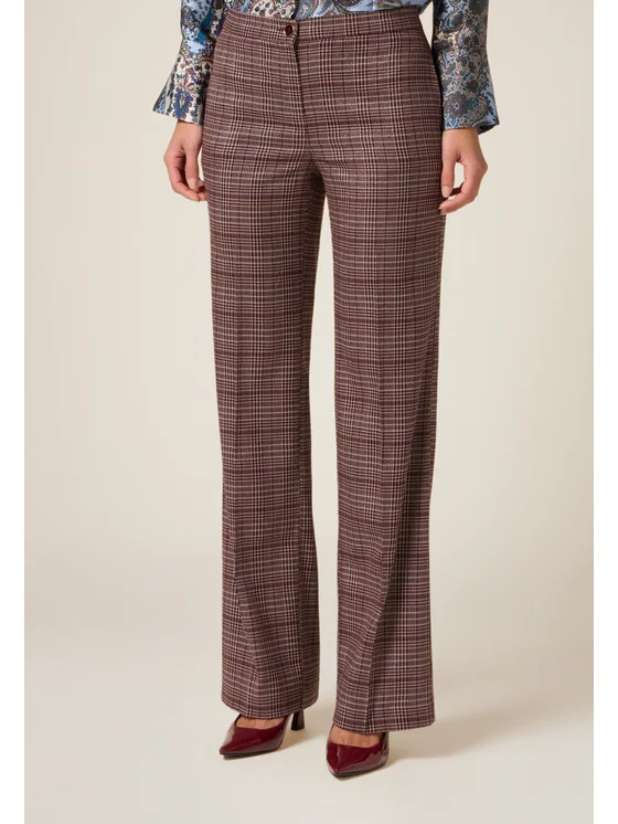 Pantaloni realizzati in flanella misto viscosa; wide leg cn piega stirata; chiusura frontale con bottone e tasche laterali inserite nei fianchi.