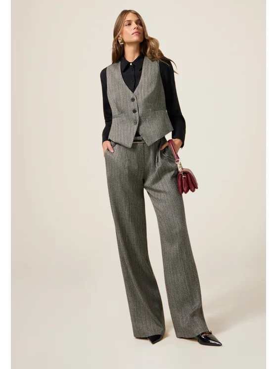 Pantaloni palazzo realizzati in flanella di poliviscosa a fantasia gessata; vita alta con cintura sottile, chiusura con gancio e zip nascosta; tasche laterali inserite nei fianchi, pieghe frontali e gamba ampia e fluida, possibilità di abbinarli al gilet coordinato; MADE IN ITALY.