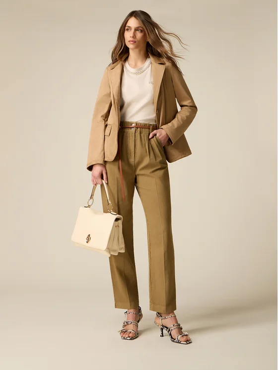 Pantaloni baggy realizzati in tessuto 100% cotone; vita elasticizzata paperbag, chiusura bottoni e zip e dettaglio di pinces frontali; tasche laterali inserite nei fianchi, piega stirata lungo le gambe e risvolto sul fondo; MADE IN ITALY.