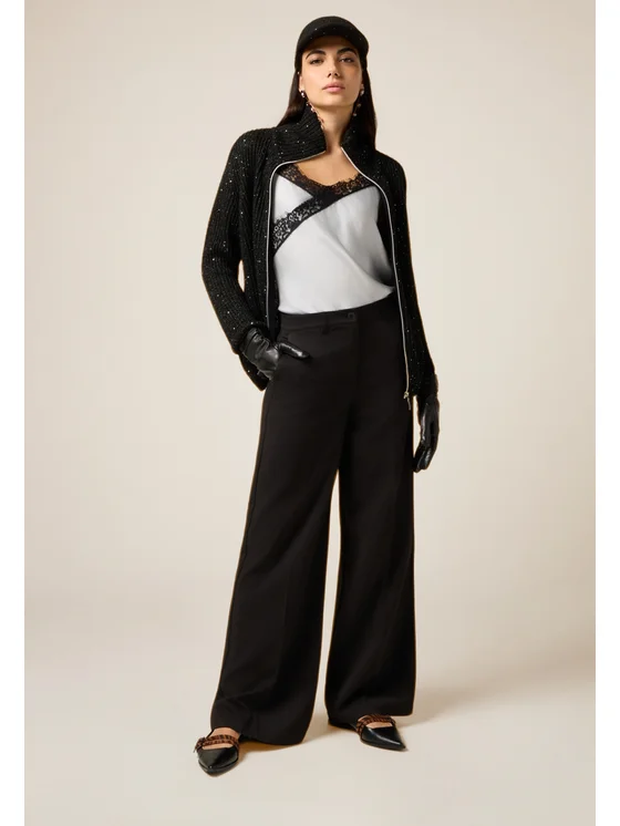 Pantaloni a palazzo realizzati in flanella tinta unita; chiusura con bottone e zip, vita regolare con passanti per cintura; tasche laterali inserite nei fianchi e piega stirata lungo le gambe; MADE IN ITALY.