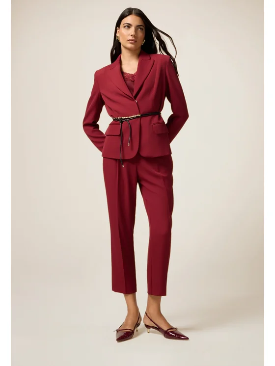 Pantaloni realizzati in fluido cady enverse satin; tasche laterali inserite nei fianchi, piega stirata lungo le gambe e chiusura sartoriale a gancio e zip; possibilità di abbinarli al blazer coordinato.