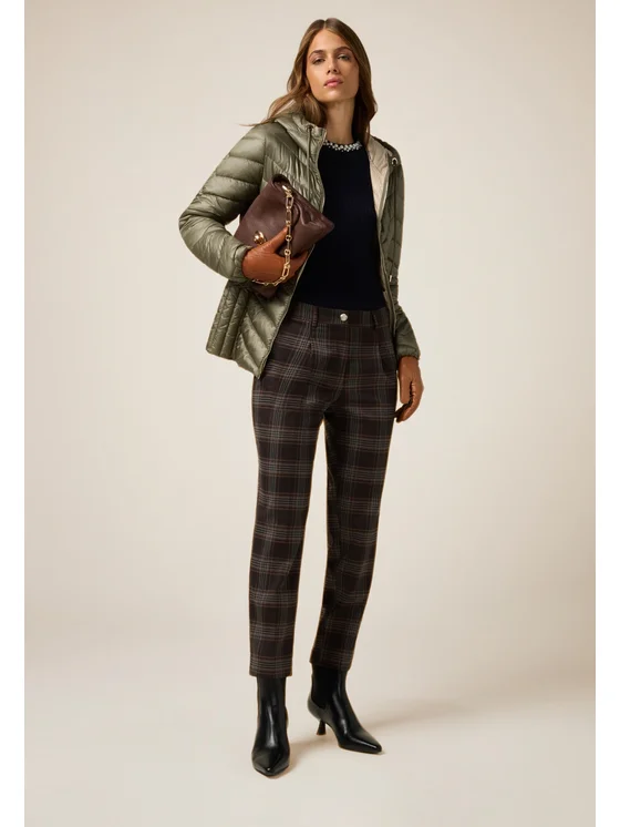 Pantaloni check realizzati in tessuto misto viscosa; lunghezza alla caviglia, piega stirata lungo le gambe; chiusura a bottone metallico e zip, tasche inserite nei fianchi.