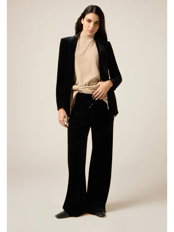 Pantaloni palazzo realizzati in velluto ad effetto sparkling; vita elasticizzata con coulisse regolabile; possibilità di abbinarli al blazer coordinato.