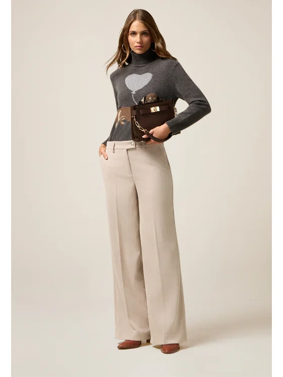 Pantaloni palazzo realizzati in velluto a coste con piega stirata lungo le gambe; vita alta con chiusura a zip e bottone; tasche laterali inserite nei fianchi.