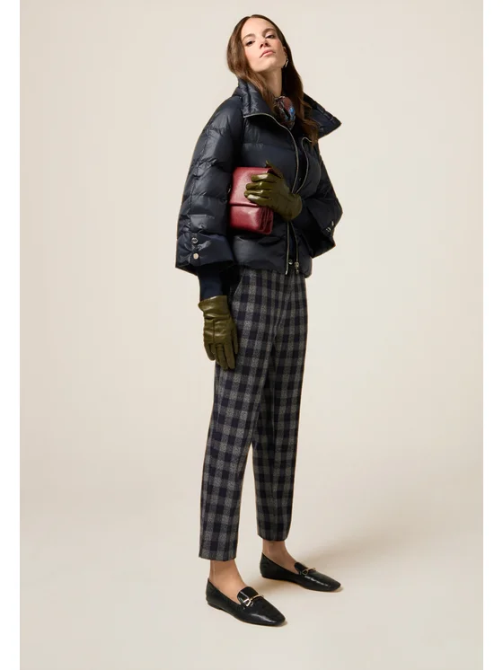 Pantaloni carrot realizzati in flanella misto viscosa a fantasia check; chiusura con zip e bottone metallico; piega stirata lungo le gambe, piccolo spacco sul fondo.