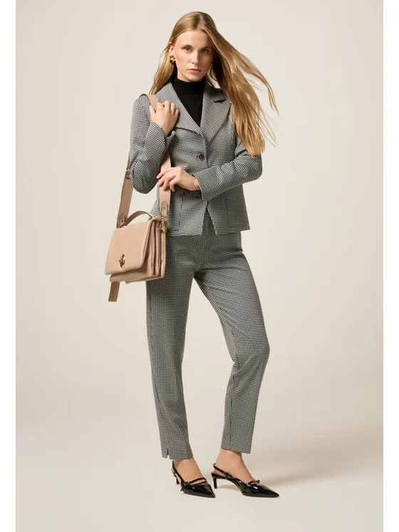 Pantaloni a sigaretta realizzati in punto milano pied-de-poule; vestibilità aderente lungo tutta la gamba; tasche laterali inserite nei fianchi e chiusura frontale, possibilità di abbinarli al blazer coordinato; MADE IN ITALY.