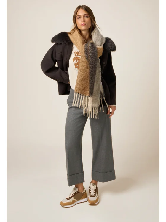 Pantaloni cropped realizzati in flanella misto viscosa con inserto di filo lurex; modello con risvolto sul fondo e piega stirata lungo le gambe; chiusura con bottone e zip, tasche laterali inserite nei fianchi.
