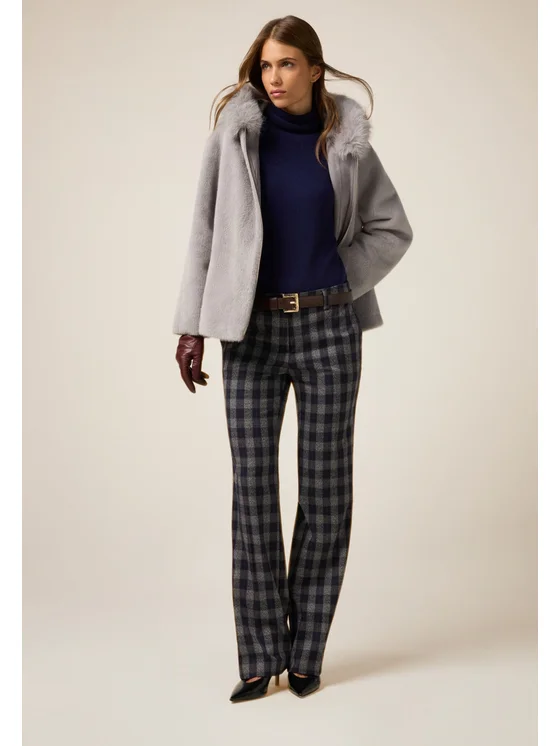 Pantaloni realizzati in flanella misto viscosa a fantasia check; chiusura con zip e bottone metallico; tasche laterali inserite nei fianchi.