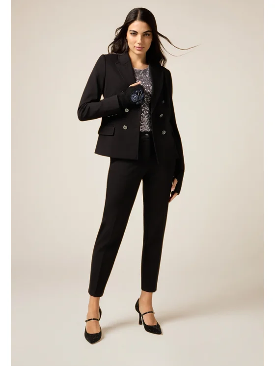 Pantalone a sigaretta realizzato in consistente punto milano; chiusura con bottone e zip, piega stirata lungo le gambe; possibilità di abbinarli al blazer coordinato.