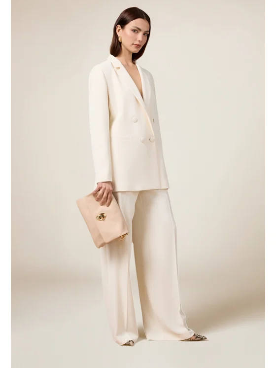 Pantaloni palazzo realizzati in fluido tessuto crêpe; tasche laterali inserite nei fianchi, piega stirata lungo le gambe; possibilità di abbinarli al blazer coordinato; MADE IN ITALY.