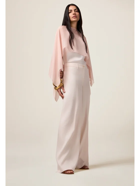 Pantaloni palazzo realizzati in twill di viscosa; wide leg, chiusura con bottone e zip; tasche laterali inserite nei fianchi, vita regolare con passanti; MADE IN ITALY.