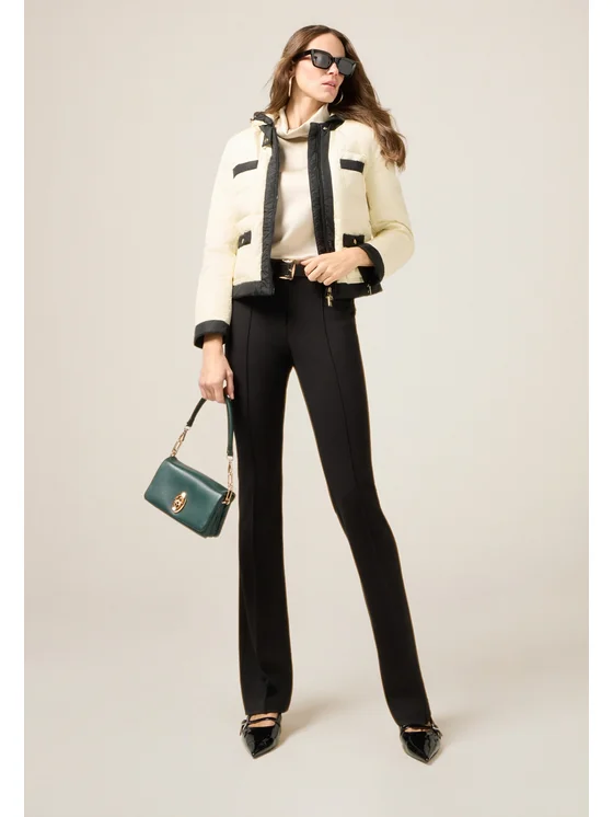 Pantaloni flare realizzati in consistente jersey punto milano; chiusura con bottone metallico decorativo, piega stirata lungo le gambe; possibilità di abbinarli al blazer coordinato.