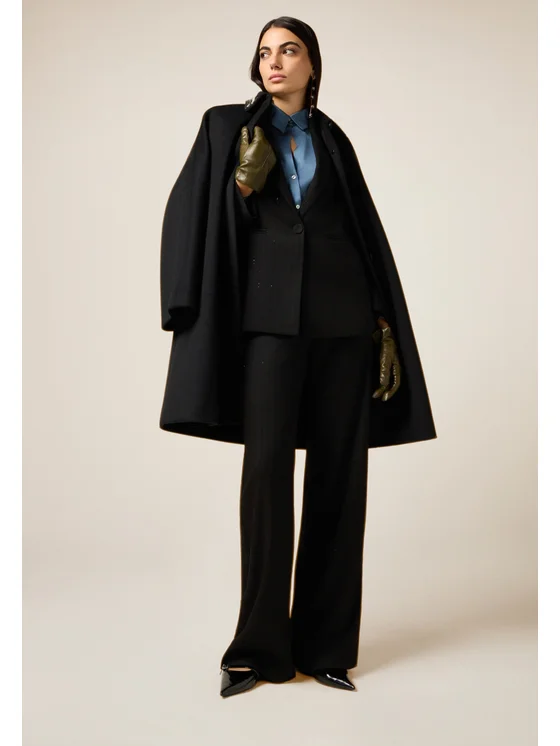 Pantaloni palazzo con ricamo effetto gessatura in micro paillettes; vita alta e vestibilità ampia con gamba dritta.; possibilità di abbinarli al blazer coordinato.