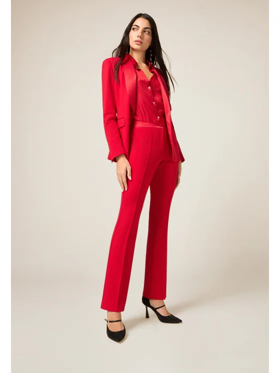 Pantaloni flare realizzati in fluido tessuto crêpe; chiusura con bottone e zip, bordo vita in raso; piega stirata lungo le gambe e possibilità di abbinarli al blazer coordinato.