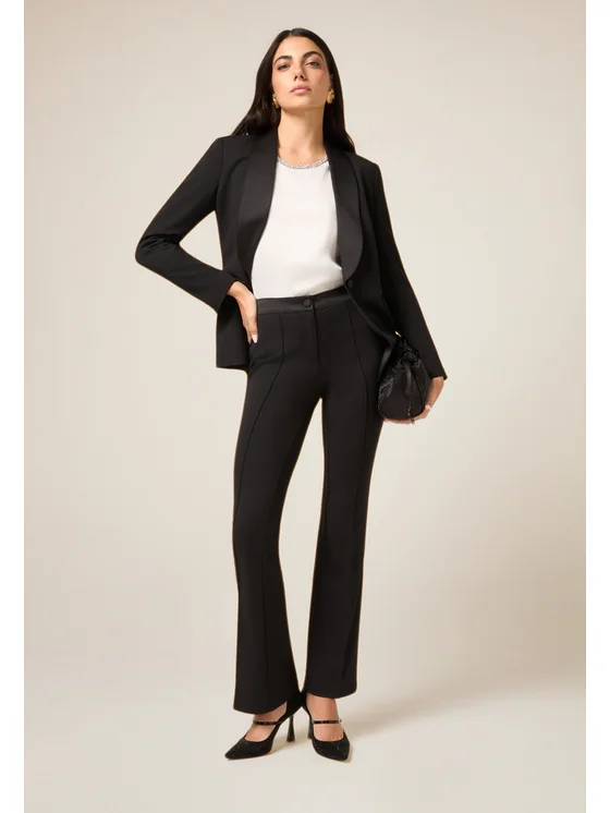 Pantaloni flare realizzati in fluido tessuto crêpe; chiusura con bottone e zip, bordo vita in raso; piega stirata lungo le gambe e possibilità di abbinarli al blazer coordinato.
