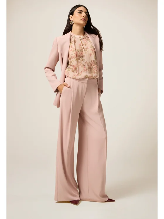 Pantaloni palazzo realizzati in tessuto fluido; chiusura sartoriale a ganci e zip, piega stirata lungo le gambe, tasche all'americana davanti; possibilità di abbinarli al blazer coordinato.