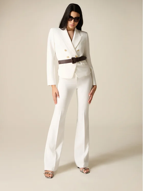 Pantaloni flare realizzati in tessuto tecnico stretch; vita alta con chiusura a zip e bottone metallico; piega stirata lungo le gambe, possibilità di abbinarli al blazer coordinato; MADE IN ITALY.