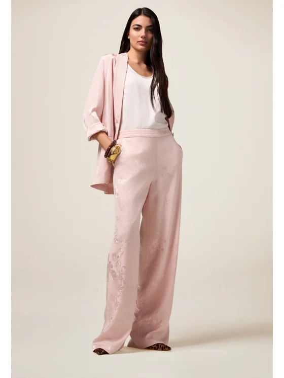 Pantaloni palazzo realizzati in tessuto jacquard di viscosa; vita elasticizzata internamente, dietro; tasche all'americana davanti.