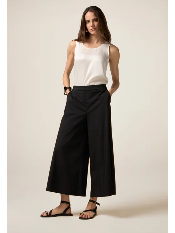 Pantaloni palazzo realizzati in tela misto cotone; vestibilità ampia con gamba larga, chiusura con fascia elastica in vita; lunghezza cropped.