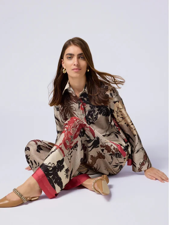 Pantaloni palazzo realizzati in raso a fantasia foliage; gambe a palazzo, chiusura a zip e bottoni; vita elasticizzata internamente; MADE IN ITALY.