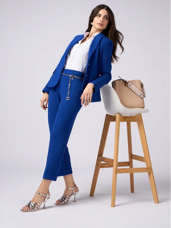 Pantaloni realizzati in tessuto scuba crêpe; modello regular, piega stirata lungo le gambe e risvolto sul fondo; chiusura a bottone metallico, tasche all'americana davanti.