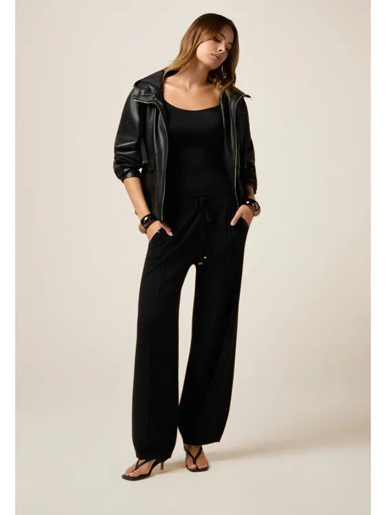 Pantaloni joggers realizzati in filato misto viscosa; vestibilità ampia con vita elasticizzata e lacci di chiusura; tasche laterali inserite nei fianchi con dettagli decorativi in paillettes.