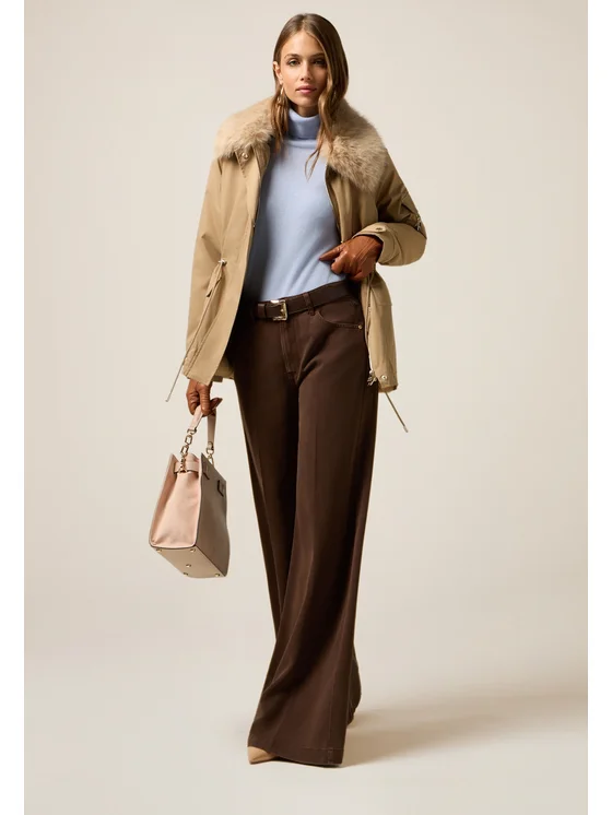 Pantaloni palazzo realizzati in fluido tencel; wide leg con piega stirata, chiusura con bottone e zip; tasche laterali inserite nei fianchi, tasche posteriori applicate.