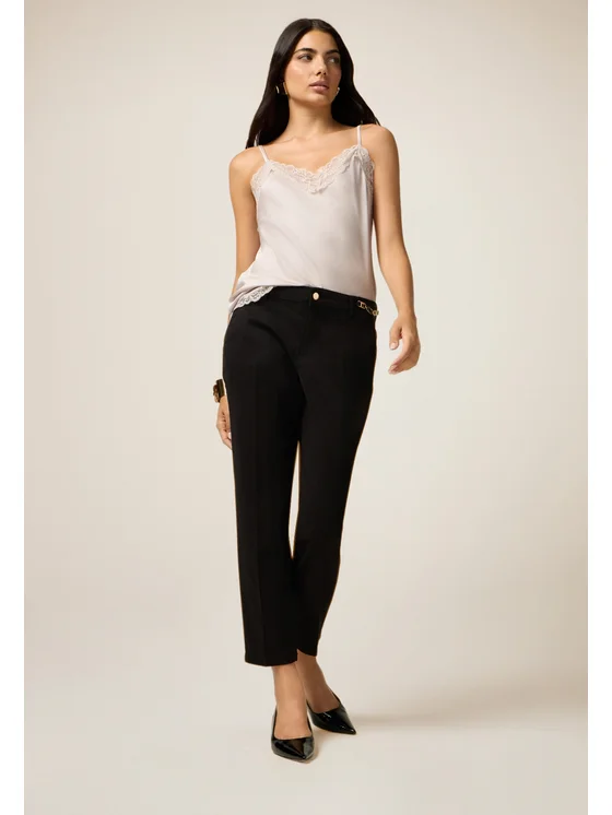Pantaloni chinos realizzati in tessuto cotone-lyocell; lunghezza alla caviglia; chiusura a bottone e zip e dettaglio decorativo a catena in metallo.