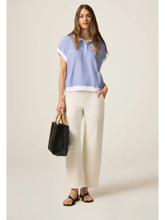 Pantaloni palazzo realizzati in tessuto misto lyocell; vestibilità ampia con chiusura a gancetti in vita; tasche laterali inserite nei fianchi; MADE IN ITALY.