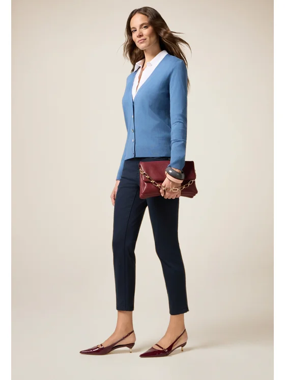 Pantaloni skinny realizzati in twill di cotone stretch tinta unita; tasche all'americana davanti e finte, a filetto, dietro; spiega stirata lungo le gambe e chiusura a bottone metallico con cristallo.