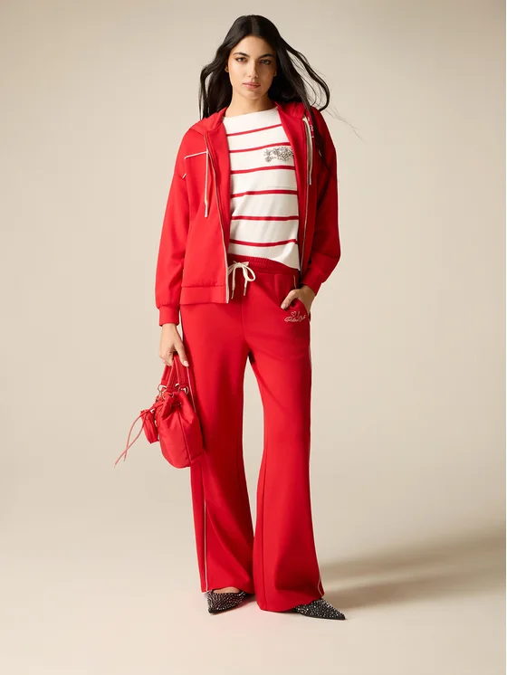 Pantaloni joggers realizzati in fluido jersey tinta unita; vita elasticizzata con coulisse, profili laterali a contrasto colore; ricamo lettering davanti; possibilità di abbinarli alla felpa coordinata.
