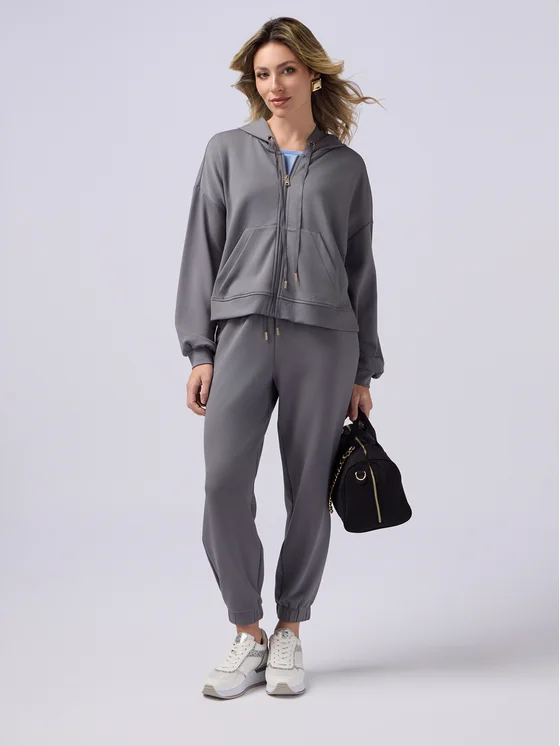Joggers realizzati in fluido jersey soft touch tinta unita; coulisse in vita, elastico sul fondo gambe, ricamo lettering davanti; possibilità di abbinarli alla felpa coordinata.