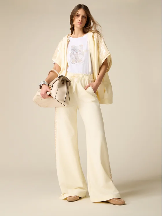 Pantaloni palazzo realizzati in jersey felpato di cotone; bande laterali con ricamo full paillettes; vita elasticizzata con coulisse regolabile e terminali metallici, tasche laterali inserite nei fianchi, possibilità di abbinarli alla felpa coordinata; MADE IN ITALY.